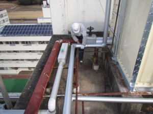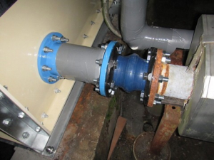 ↓フレキシブルジョイントを使って繋げます。配管は気温の変化で伸縮しますし、地震の振動による破損も防止します。